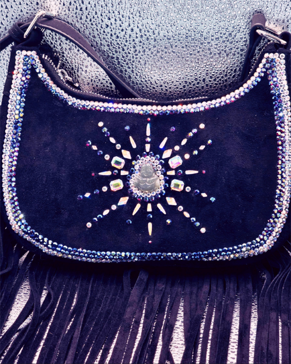 Soft Suede Fringe Shoulder Bag With Jade Buddha and Preciosa Austrian Crystals. BEAUTIFUL BAG. Dimensions: Approximately 39 inches long from top of the strap to the longest end of the fringe; bag portion is approximately 7 1/2 inches long and 11 1/2 inches wide. Great size and very eye catching. Works as evening bag and everyday bag as well. If you like the bag and would like different colors or pattern of stones, please fill out the Customization Form and I will get back to you to discuss. I have several of the plain bags in stock, all in black.