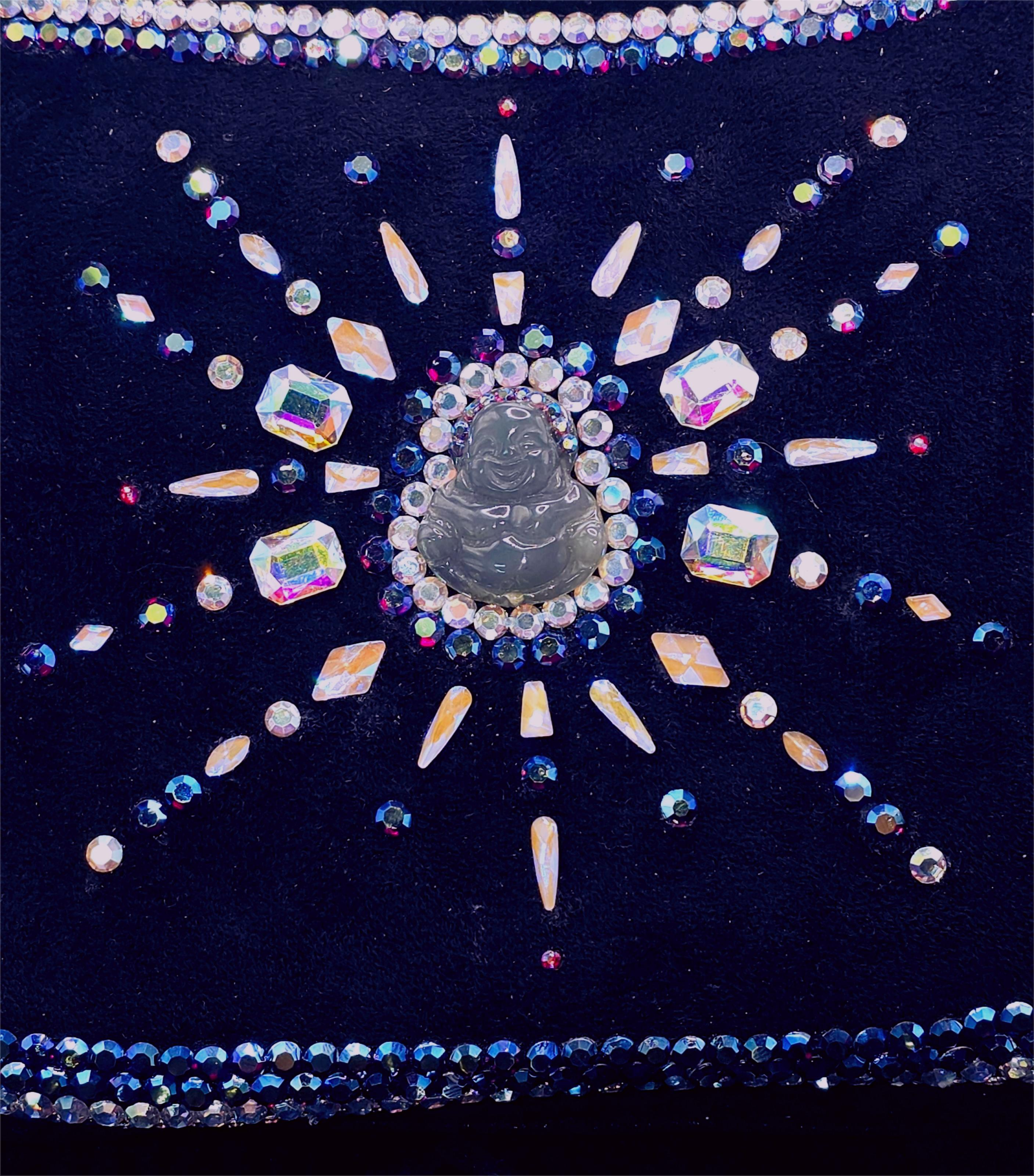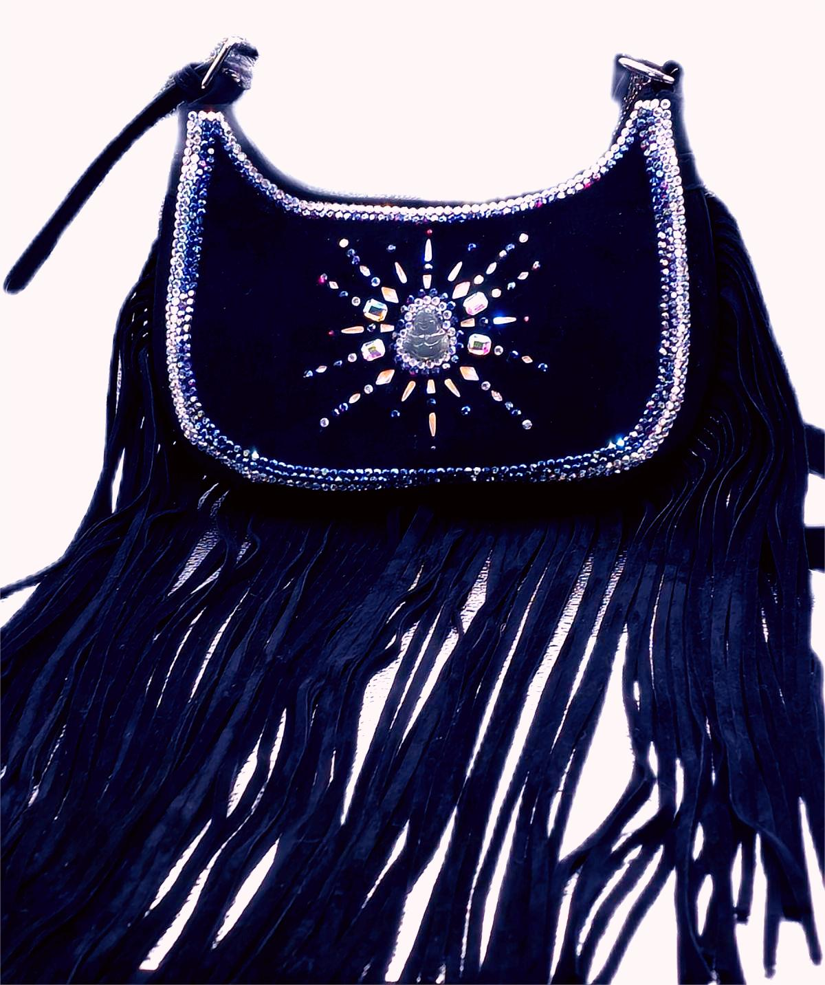 Soft Suede Fringe Shoulder Bag With Jade Buddha and Preciosa Austrian Crystals. BEAUTIFUL BAG. Dimensions: Approximately 39 inches long from top of the strap to the longest end of the fringe; bag portion is approximately 7 1/2 inches long and 11 1/2 inches wide. Great size and very eye catching. Works as evening bag and everyday bag as well. If you like the bag and would like different colors or pattern of stones, please fill out the Customization Form and I will get back to you to discuss. I have several of the plain bags in stock, all in black.