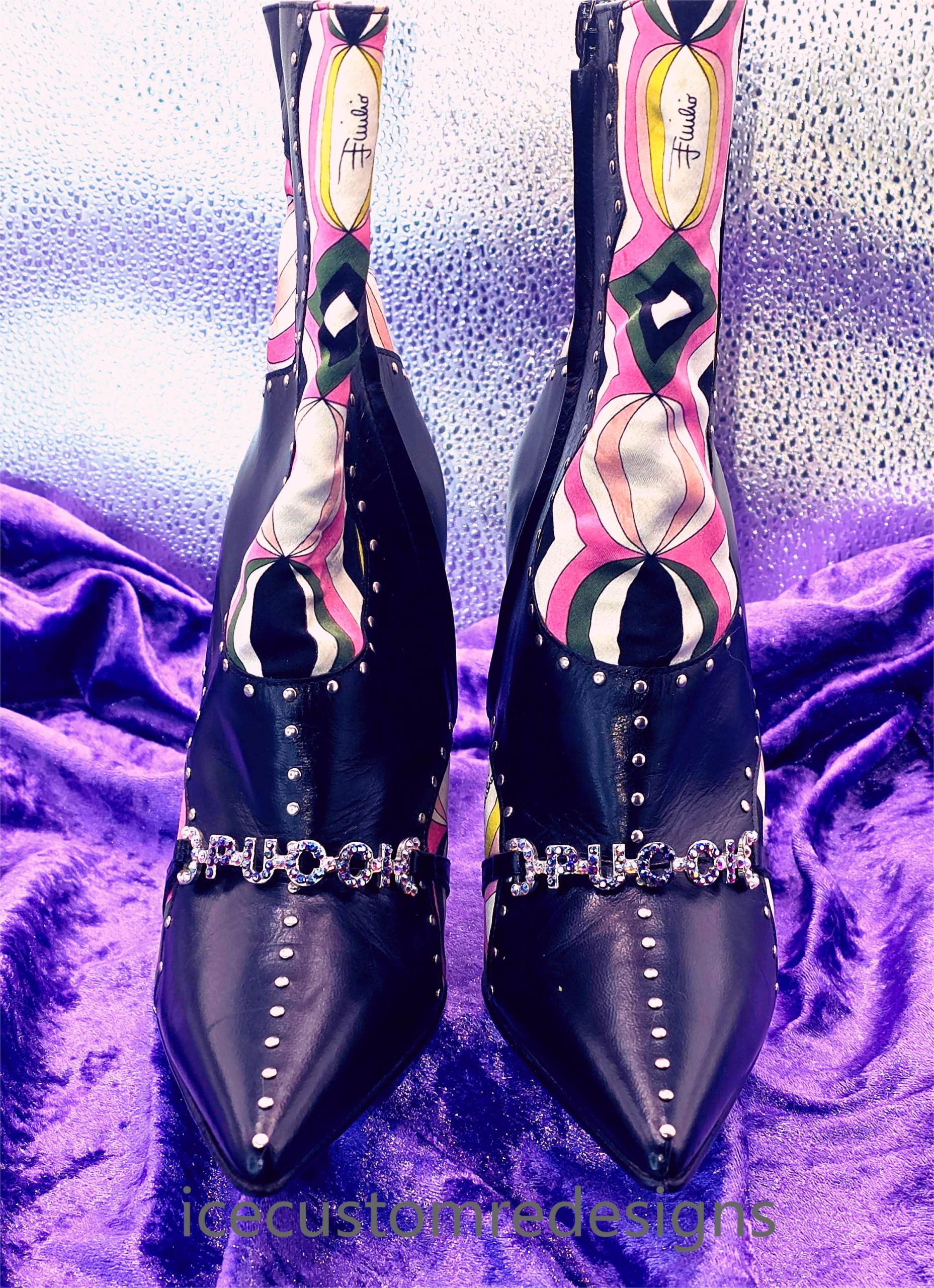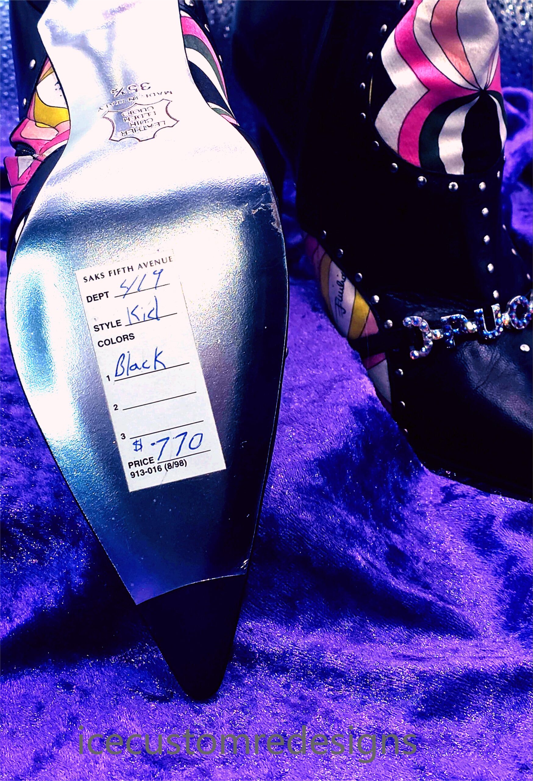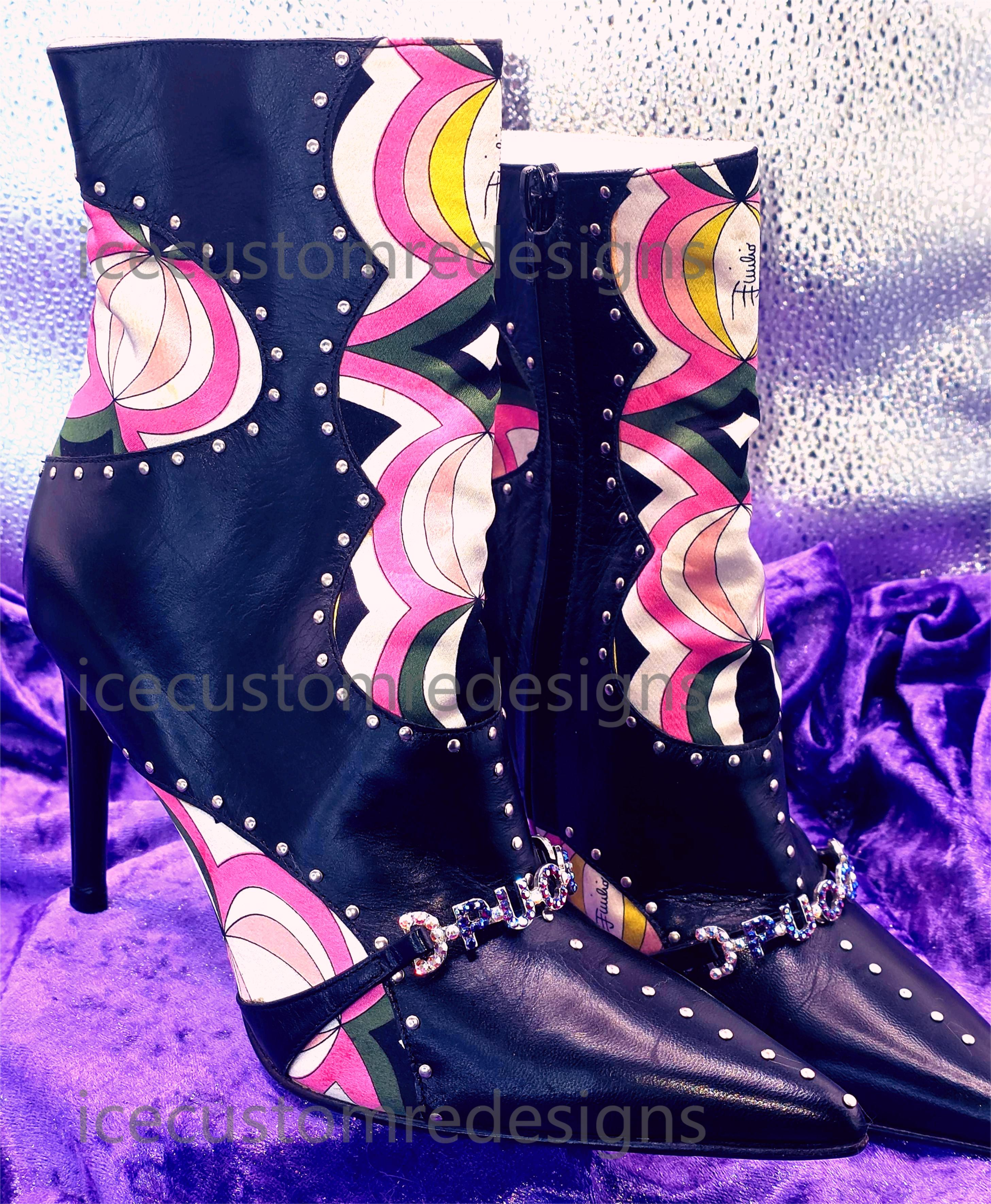 VINTAGE Emilio Pucci Leather & Satin Boots With Studs and Austrian Crystals. Never worn outside. Fing Beautiful Boots.